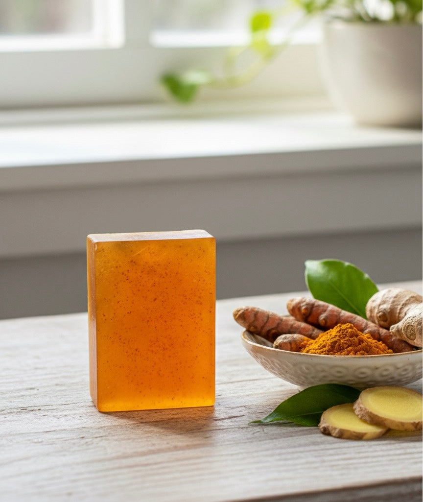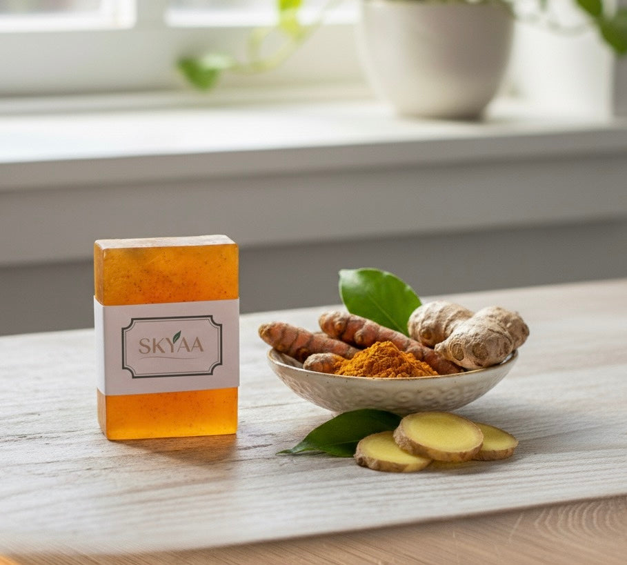 A radiant, all-natural soap handcrafted with organic, homegrown turmeric — dried and ground into a fine golden powder to reflect authenticity and tradition. Each bar embodies SKYAA’s timeless promise of pure, organic care, helping you achieve a naturally luminous complexion without chemicals or additives.